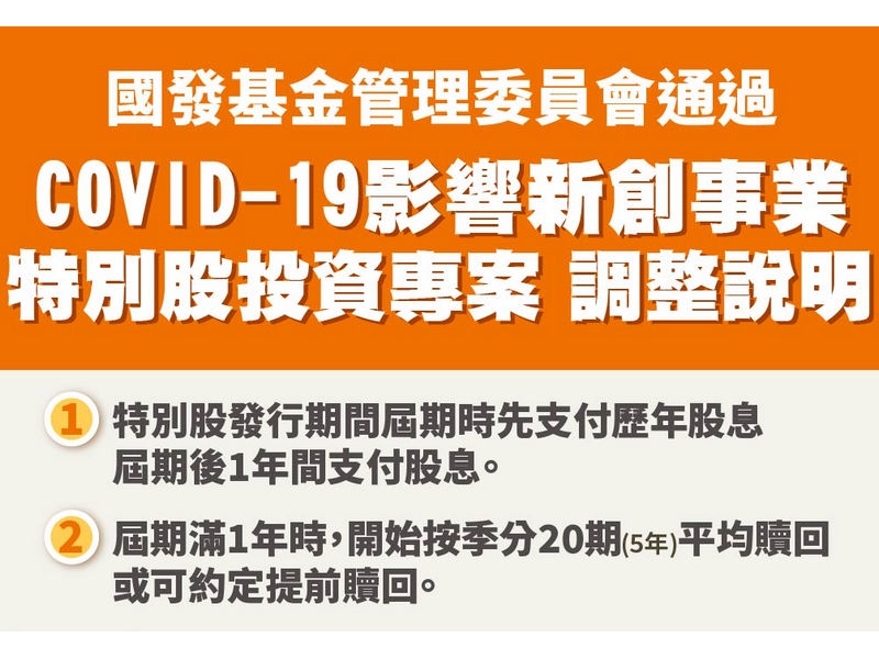 國家發展基金「對受嚴重特殊傳染性肺炎影響新創事業投資專案」 調整特別股贖回方式